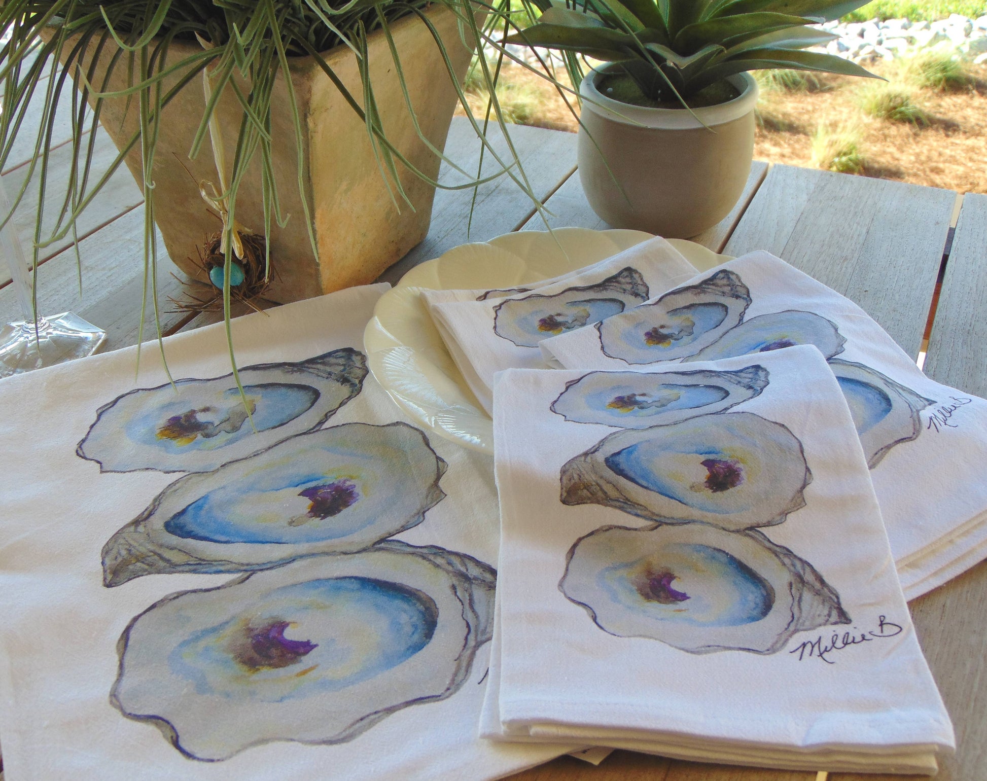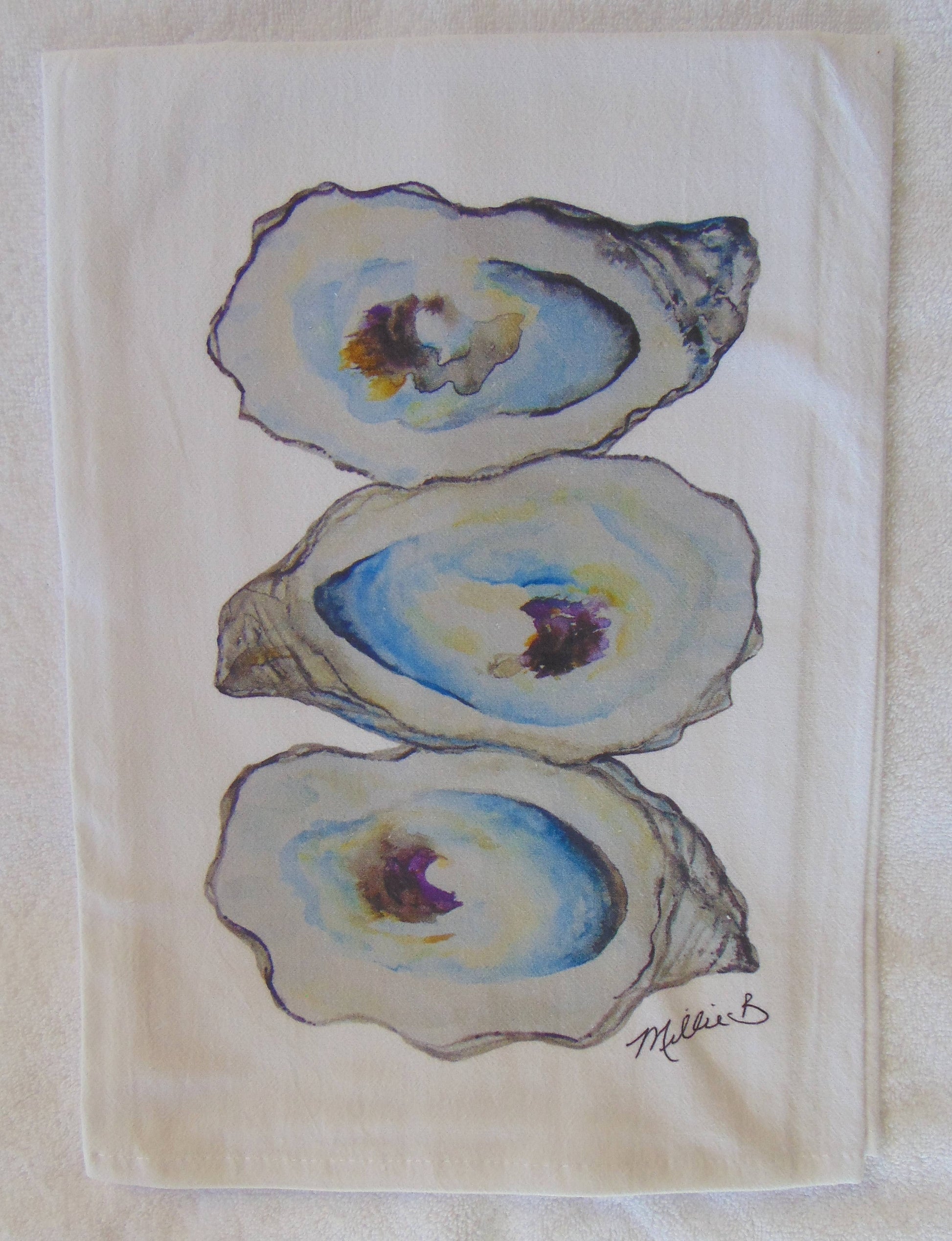 Limited edition Watercolor 3 Oysters print on white flour sack towel. Our high-quality crinkled cotton is one of the most desirable fibers used for kitchen towels. 100% cotton dish towels are absorbent and don’t leave behind lint or another residue when drying dishes. We’ve designed a semi-custom full of a variety of design genres, such as, urban, coastal and pet-themed flour sack towels. Consequently, you will have the luxury of selecting the paint color that is most suitable for your decor on your personalized flour sack towel. Our printed cotton towels have been featured in Coastal Living Magazine, Anthropologie, Birch Lane stores and many other popular retailers.
