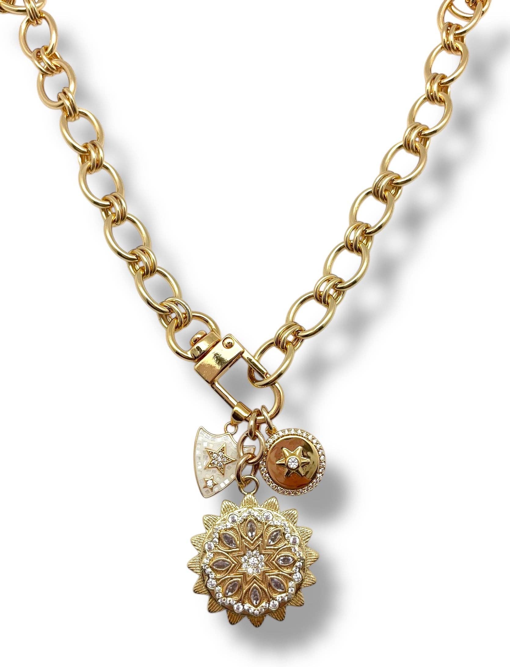 The Clover Bloom Charm is a golden symbol of luck and beauty, featuring a softly textured flower with a radiant clover nestled at its center.